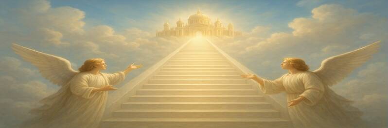 Ik was eigenlijk van plan om te doen alsof mijn neus bloedde, maar die vlieger ging niet op. Midden in de nacht stond ik plotseling voor een lange trap, waarnaast twee gezanten mij maanden naar boven te lopen. Ik kwam in een grote wachtkamer waar nog meer mensen zaten en moest een nummertje trekken. De sfeer deed denken aan die bij een tandarts, de één zat er zelfverzekerd bij, de ander zat er met angst en beven. Het viel me ook op dat de mensen die naar binnen gingen niet altijd weer naar buiten kwamen. Als de volgende aan de beurt was kwam er een engel de wachtkamer in met een lier die een hemels akkoord speelde en het volgende nummertje zong. Toen ik aan de beurt was moest ik eerst een voorportaal in waar een engel mij wat controlevragen stelde, wie mijn ouders waren geweest en wat mijn geboortedatum was en zo. Hierna mocht ik door naar de volgende kamer.